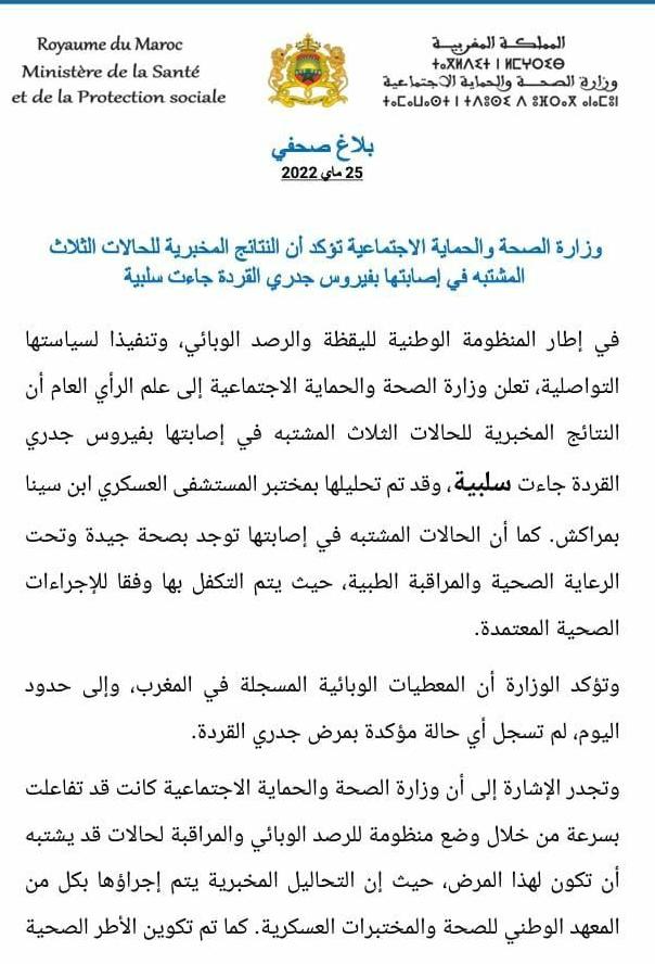 وزارة الصحة والحماية الإجتماعية تؤكد أن النتائج المخبريةللحالات الثلات المشتبه في اصابتها بفيروس جدري القردة جاءت سلبية