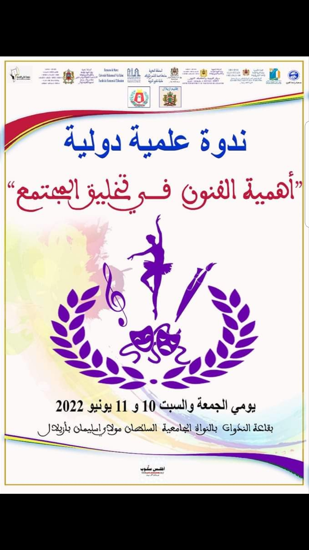 ستشهد قاعة الندوات بالنواة الجامعية لجامعة السلطان مولاي سليمان لازيلال ندوة علمية دولية بعنوان “أهمية الفنون في تخليق المجتمع” وذلك من تنظيم جمعية واحة الفنون بشراكة مع المديرية الإقليمية لوزارة التربية الوطنية والتعليم الأولي والرياضة وجامعة السلطان مولاي سليمان. وتتغيى هذه الندوة ابراز دور التربية على الفنون في تأطير المجتمع وتهذيبه من أجل خلق المواطن الصالح