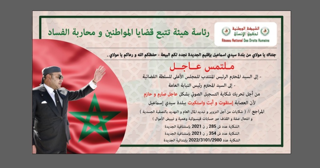بناء على ما قامت به هيئة تتبع قضايا المواطنين ومحاربة الفساد للشبكة الوطنية لحقوق الإنسان سيدي اسماعيل اقليم الجديد بوقفة سلمية أمام المجلس الاعلى للقضاء الرباط صباح يوم الجمعة 5يوليوز 2022 في شأن الاستجابة الفورية للشكايات دات انتحال الصفة والتزوير ونهب مال الشعب ضد بعض المسؤولين داخل لجن المختصة لمالية الجماعة.سيدي اسماعيل الجديدة.