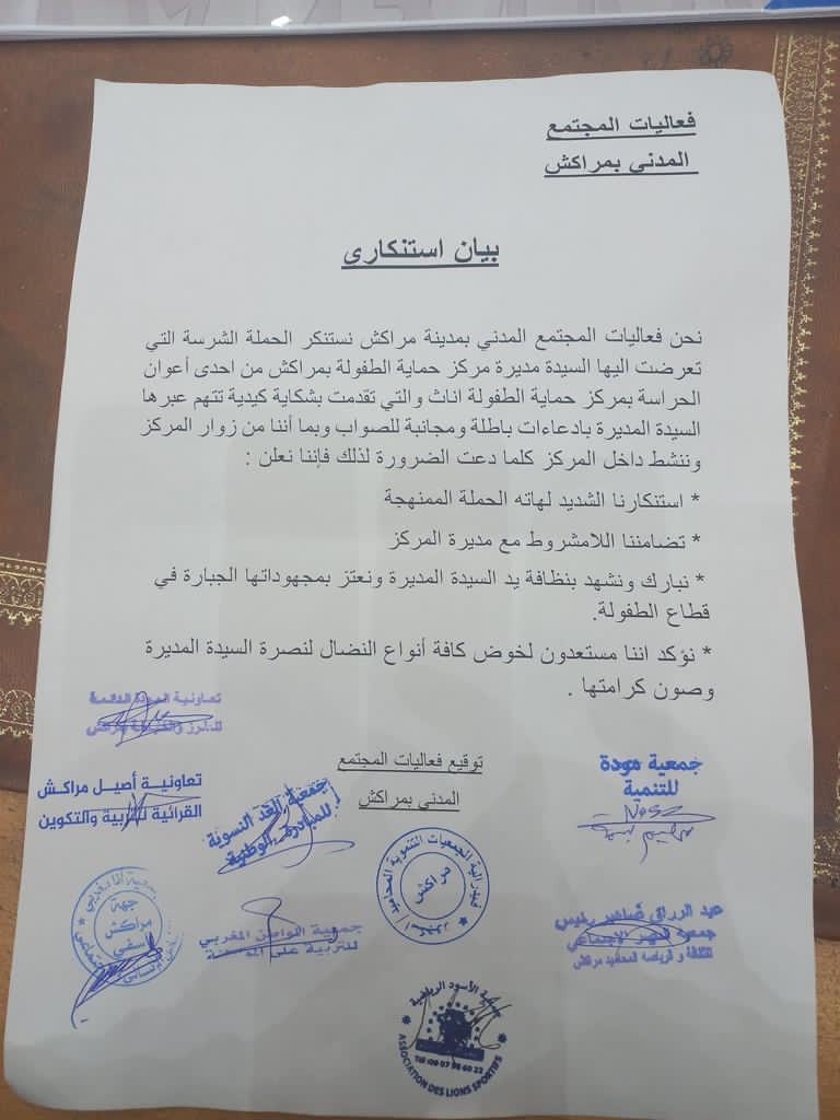 بيان استنكاري لجمعيات المجتمع المدني بمدينة مراكش في شأن التضامن مع مديرة المركز لحماية الطفولة .