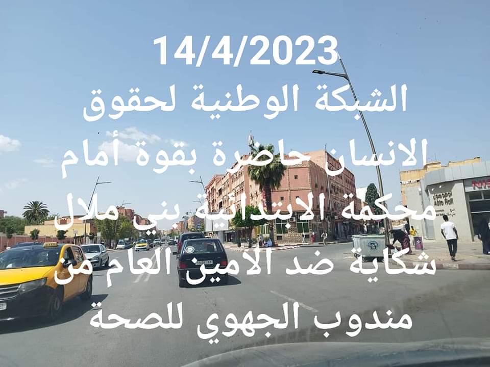 يوم الثلاثاء بمحكمة الابتدائية بني ملال “14/4/2023” كان التقديم بالنسبة الأمين العام للشبكة الوطنية لحقوق الانسان “في شأن شكاية المندوب الجهوي للصحة ” تتعلق بمحاولة الصاق تهمة التشهير .