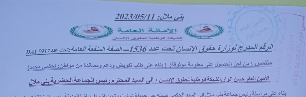 الامين العام حسن انوار ” الشبكة الوطنية لحقوق الانسان والاستاذ حسن الحرشي رئيس الجمعية المغربية لحقوق الانسان ” تم مناقشة الملف مباشرة مع رئيس الجماعة الحضري بني ملال السيد بدرة زوال اليوم الاربعاء 10 ماي 2023.
