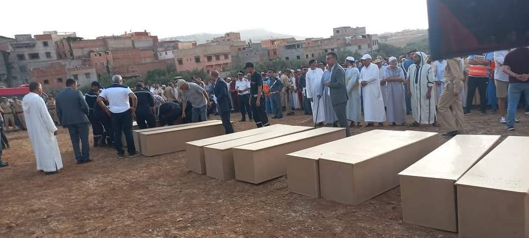 عامل إقليم أزيلال ومرافقه والسيد وكيل جلالة الملك أزيلال ورئيس المحكمة الابتدائية ازيلال والقيادة للدرك الملكي والقوة المساعدة والوقاية المدنية يحضرون تشييع جنازة ضحايا المأساة حادث اخاشان بجماعة سيدي بولخف اقليم دمنات