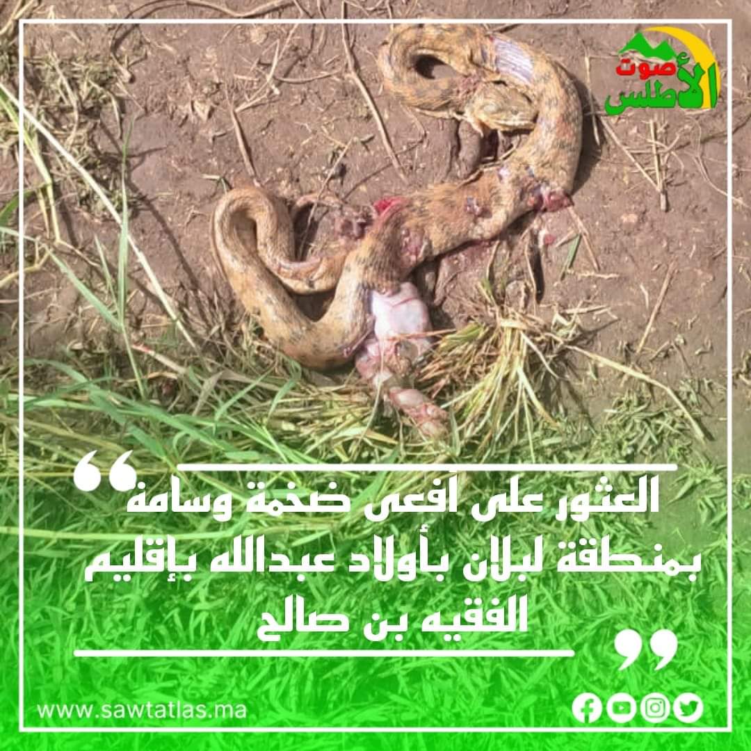 على إثر دورية قام بها بعض موظفي الجماعة الترابية خلفية،صبيحة يوم الجمعة 18،غشت الجاري،على مستوى منطقة لبلان بأولاد عبدالله،لمراقبة مياه الشرب،تم العثور على أفعى ضخمة وسامة، بالقرب من سكن أحد المواطنين الكائن ب:”النميرو 5″وبالضبط جانب العداد المائي،حيث تم قتلها بتعاون بعض المواطنين.