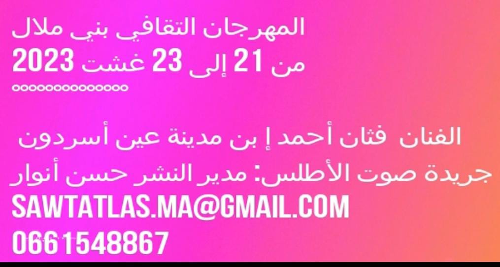 المهرجان التقافي التاني لمدينة بني ملال / الفنان أحمد فثان جريدة صوت الاطلس. https://youtu.be/9oBsSqQ3zyU?si=9X3D8uT7kFBys422