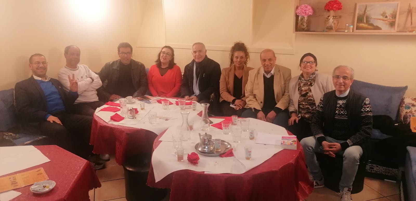 . في لقاء تواصلي مع مجموعة من الأساتذة باحثين من مغاربة العالم. لقاء تطرقت فيه المجموعة لعدة نقط تهم الوطن الأم ومستقبل الجيل الثالث والرابع وكيف سيكون مستقبلهم مع الوطن الآم. كيف يجب التعامل مع هده الشريحة من المجتمع مع العلم أنهم ازدادوا وترعرعوا هنا في أوروبا. أسئلة وأخرى ناقشتها المجموعة وماذا هيأت لهم بلد أبأهم وأجدادهم حتى يمكنهم حمل المشعل. الشكرالجزيل للحضور الكريم. طاطا ميلودة ناشطة كبيرة من أجل المرأة المغربية في المناطق القروية. السيدة سمية الشرايبي عارضة أزياء، سي محمد البشيري خبير في اليونسكو، للا وفاء الملحقة التجارية، سي بوشعيب حركاتي مؤسس و رئيس جمعية التضامن الأوروبي المغربي بباريس. سي يوسف شهاب باحث وأستاذ بجامعة السوربون وسي جابر عبد الله مدير عقاري وسي نجيب لحلو مستشار في الإدارة والتكوين. كاتب ومحاضر، وسي حسين خاص رئيس الجمعية ذات المركز الاستشاري لدى الأمم المتحدة