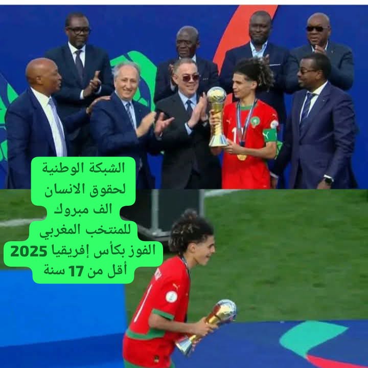 تؤكد الشبكة الوطنية لحقوق الإنسان دعمها الكامل وتشجيعها لجميع منتخباتنا الوطنية، ونحتفي بكل فخر واعتزاز بهذه الإنجازات التي ترفع اسم المغرب عاليًا في مختلف المسابقات. ألف مبروك لأسود الأطلس الصغار!
