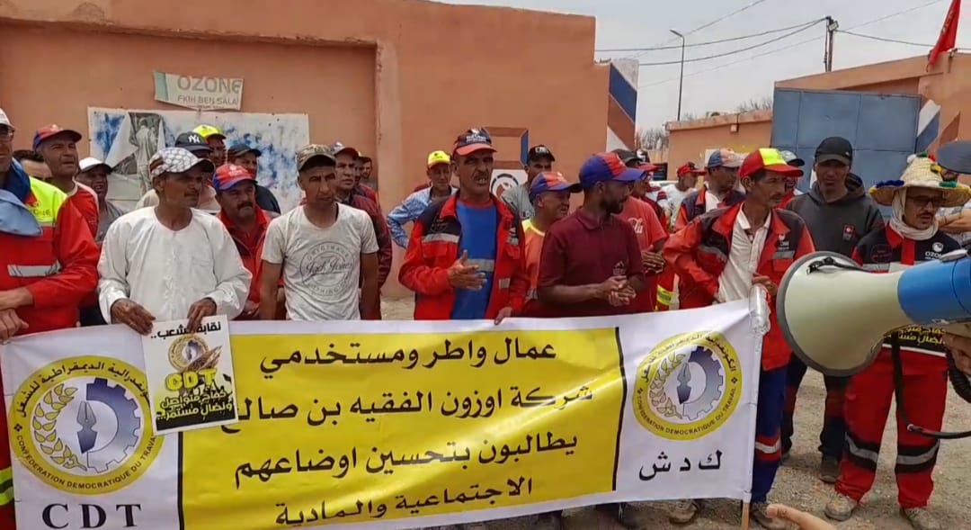 نظم عمال شركة “أوزون” بمدينة الفقيه بن صالح، الأربعاء 18يونيو 2025 ، وقفة احتجاجية إنذارية أمام مقر شركة اوزون بالفقيه بن صالح ، وذلك بدعم من الاتحاد المحلي للكونفدرالية الديمقراطية للشغل (CDT)، والمكتب الإقليمي للنقابة الوطنية للجماعات والتربية والتدبير المفوض.