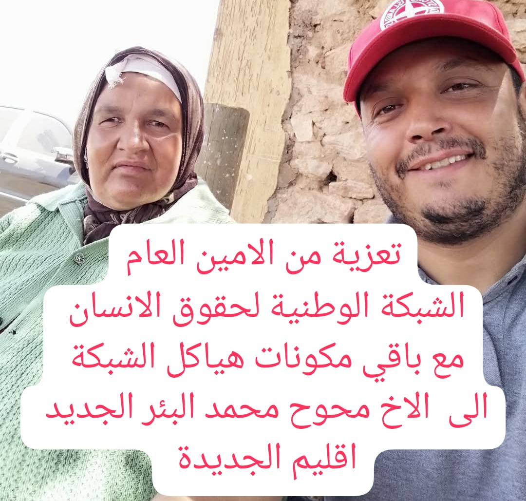 ببالغ الحزن والأسى، وبقلوب مؤمنة بقضاء الله وقدره، يتقدم الأمين العام انوار حسن الهاتف 0661548867 للشبكة الوطنية لحقوق الإنسان، بمعية كافة رؤساء الفروع والهيئات، بأحر التعازي وأصدق مشاعر المواساة إلى الأخ محمد محوح، المندوب الوطني السابق للشبكة الوطنية لحقوق الإنسان، على إثر وفاة شقيقته المشمولة بعفو الله ورحمته. لقد عرفناكم أخاً كريماً، وإنساناً طيباً، ساهمتم بكل إخلاص وتفانٍ في بناء صرح الشبكة بمدينة البئر الجديد – إقليم الجديدة، وتركتم بصمة واضحة في مسيرة العمل الحقوقي الوطني. نسأل الله العلي القدير أن يتغمد الفقيدة بواسع رحمته، ويسكنها فسيح جناته، وأن يلهمكم وكافة أفراد أسرتكم الكريمة جميل الصبر والسلوان. إنا لله وإنا إليه راجعون. عن الأمانة العامة. الامين العام الشبكة الوطنية لحقوق الإنسان