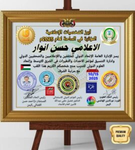 يشرفني ويسعدني أن أتقدّم إلى معاليكم بأسمى عبارات الشكر والعرفان والتقدير، على مبادرتكم الكريمة ومنحي وسام الشرف الإعلامي لسنة 2025، وهو تتويج أعتزّ به وأحمله بكل فخر واعتزاز، بصفتي الإعلامي والصحافي أنوار حسن، مدير نشر جريدة صوت الأطلس بالمملكة المغربية الشريفة.