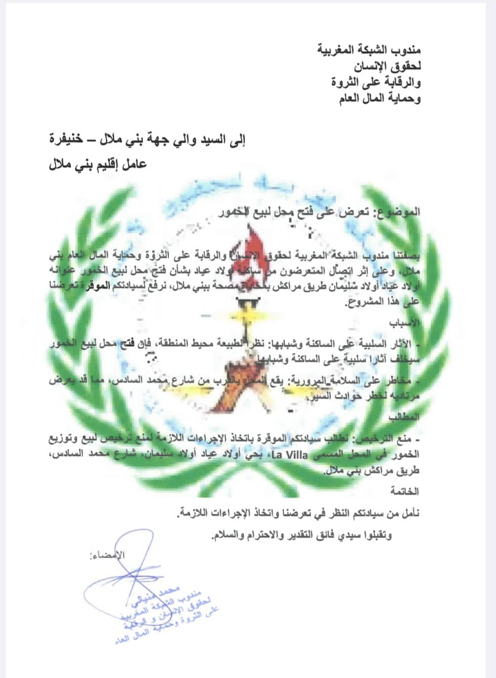 بيان من الشبكة المغربية لحقوق الإنسان والرقابة عن الثروة وحماية المال العام في شأن تعرض على فتح خمارة ببني ملال