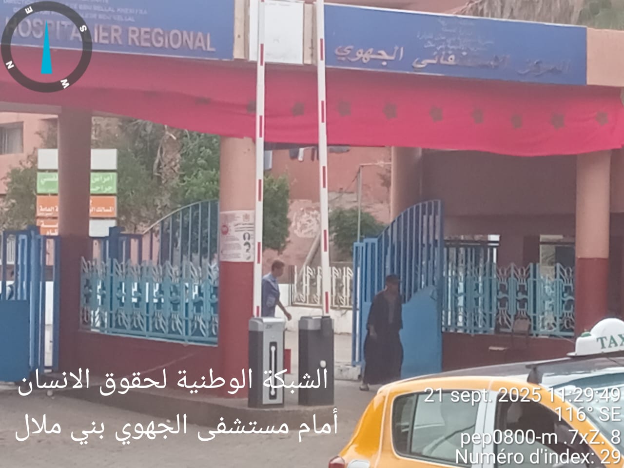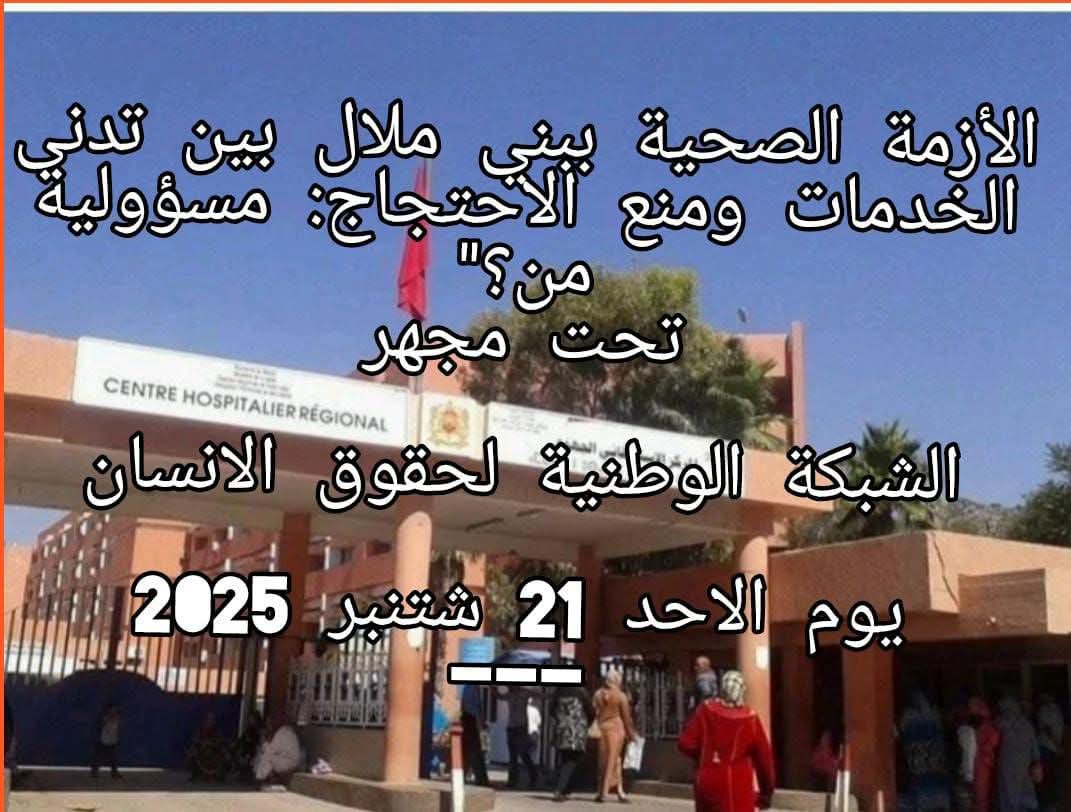 “الحق في الصحة بين الدستور والواقع: منع وقفة احتجاجية أمام المستشفى الجهوي ببني ملال” “بني ملال: المنع الأمني والخذلان الشعبي أمام الانهيار الصحي” تحت مجهر الشبكة الوطنية لحقوق الانسان