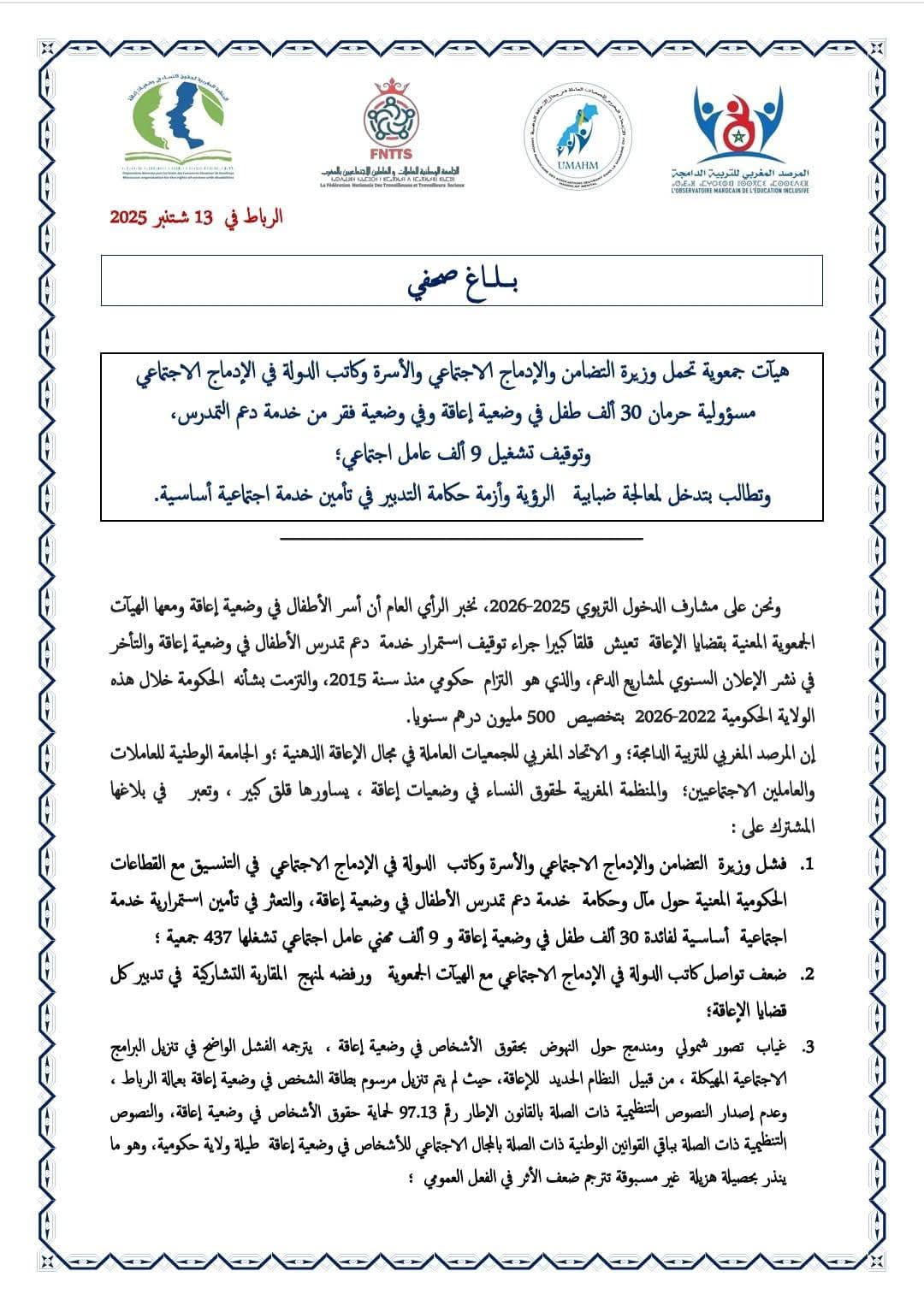 بلاغ صحفي حقوقي الرباط في 13 شتنبر 2025 “هيئات وطنية تحمل الحكومة المغربية مسؤولية حرمان 30 ألف طفل في وضعية…