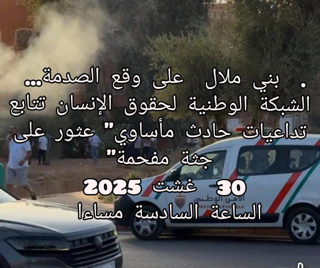 . بني ملال على وقع الصدمة… الشبكة الوطنية لحقوق الإنسان تتابع تداعيات حادث مأساوي” عثور على جثة مفحمة”