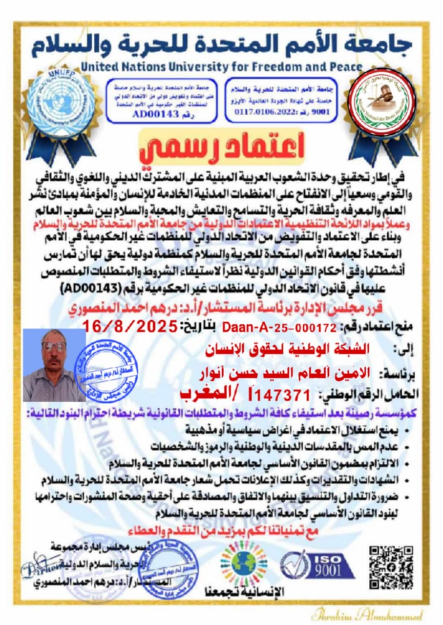 بيان رسمي وإعلامي. “اعتماد أممي تاريخي للشبكة الوطنية لحقوق الإنسان الامين أنوار حسن” جريدة صوت الاطلس بقلم. مدير النشر انوار…