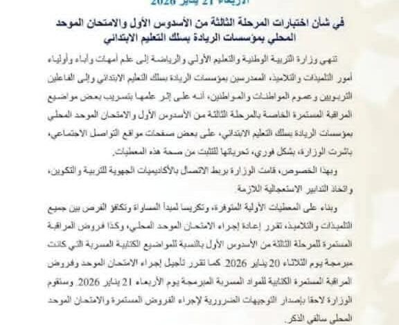 في خطوة عاجلة، أعلنت وزارة التربية الوطنية والتعليم الأولي والرياضة عن اتخاذ تدابير فورية عقب تسريب بعض مواضيع المراقبة المستمرة والامتحان الموحد المحلي الخاص بسلك التعليم الابتدائي بمؤسسات الريادة، وذلك عبر منصات التواصل الاجتماعي.