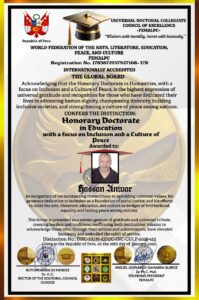 إقرارًا بأن الدكتوراه الفخرية في الإنسانيات، مع التركيز على الإدماج وثقافة السلام، تمثل أسمى تعبير عن الامتنان العالمي والتقدير لأولئك الذين كرّسوا حياتهم للنهوض بالكرامة الإنسانية، والدفاع عن التنوع، وبناء مجتمعات شاملة، وتعزيز ثقافة السلام بين الأمم؛