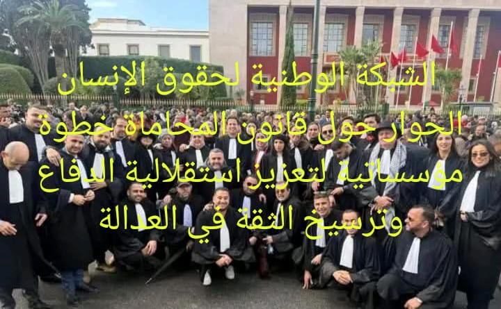 الشبكة الوطنية لحقوق الإنسان تدعو إلى ترسيخ الثقة المؤسساتية عبر حوار جاد حول قانون مهنة المحاماة بقلم مدير. النشر جريدة صوت الاطلس والأمين العام انوار حسن الهاتف 0661548867