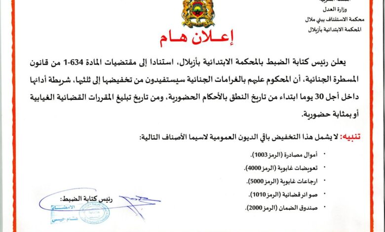 أعلنت رئاسة كتابة الضبط بالمحكمة الابتدائية بأزيلال عن إجراء تحفيزي لفائدة المحكوم عليهم في القضايا الزجرية، يقضي بإمكانية الاستفادة من تخفيض في قيمة الغرامات المحكوم بها، يصل إلى حدود الثلثين، وذلك في حال المبادرة إلى أدائها داخل أجل أقصاه 30 يوماً. ويُحتسب هذا الأجل ابتداءً من تاريخ النطق بالأحكام بالنسبة للقضايا الحضورية، أو من تاريخ تبليغ المقررات القضائية بالنسبة للأحكام الغيابية أو التي تُعتبر في حكم الحضورية. ويأتي هذا الإجراء في إطار تفعيل مقتضيات القانون المنظم للمسطرة الجنائية، بما يعزز ثقافة الامتثال للأحكام القضائية وتسريع وتيرة تنفيذها. وفي المقابل، تم التنبيه إلى أن هذا التخفيض لا يشمل بعض المستحقات المالية ذات الطابع الخاص، من قبيل الأموال المصادرة، والتعويضات المدنية، والإرجاعات، إضافة إلى صوائر القضايا وصندوق الضمان، باعتبارها مستثناة من هذا الامتياز. ويُنتظر أن يساهم هذا القرار في تخفيف العبء المالي عن المحكوم عليهم، مقابل تشجيعهم على تسوية وضعيتهم القانونية داخل الآجال المحددة.