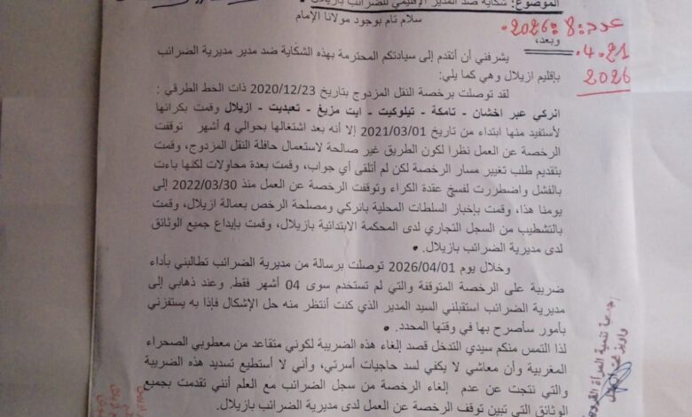 مراسلة قوية موجهة إلى مختلف السلطات المعنية، يضع محمد وخريبوش، مراسل متعاون مع جريدة صوت الأطلس، وواحد من متقاعدي ومعطوبي الصحراء المغربية، ملفًا يثير أكثر من علامة استفهام حول تدبير وضعية رخص النقل المزدوج بإقليم أزيلال، وما ترتب عنها من تبعات ضريبية وصفها بغير المبررة. وأوضح المشتكي أنه حصل بتاريخ 23 دجنبر 2020 على رخصة للنقل المزدوج تربط بين مجموعة من الدواوير والمناطق الجبلية، غير أن هذه الرخصة لم تعمّر طويلًا في الخدمة، إذ لم تتجاوز مدة استغلالها أربعة أشهر فقط، بسبب هشاشة البنية الطرقية، خاصة على مستوى مقطع “آيت مزيغ – تعبديت”، الذي أصبح غير صالح لمرور هذا النوع من النقل. ورغم محاولاته المتكررة لتغيير مسار الرخصة عبر محور واويزغت – أزيلال، بما يضمن استمرارية النشاط، يؤكد المعني أنه لم يتلقَّ أي رد من الجهات المختصة، ما دفع المكتري إلى فسخ عقد الكراء والتخلي عن استغلال الرخصة، لتتوقف بشكل نهائي منذ 30 مارس 2022. وفي سياق الإجراءات القانونية، أفاد أنه قام بإشعار السلطات المحلية والمصالح المختصة، كما بادر إلى التشطيب من السجل التجاري بالمحكمة الابتدائية بأزيلال، وأودع جميع الوثائق المطلوبة لدى إدارة الضرائب، في خطوة تهدف إلى تسوية وضعية الرخصة المتوقفة. غير أن المفاجأة، حسب تعبيره، كانت توصلُه مطلع أبريل 2026 بإشعار ضريبي يُلزمه بأداء مستحقات عن رخصة لم تعد تشتغل منذ سنوات، ولم تُستغل إلا لفترة وجيزة. وهو ما اعتبره تناقضًا واضحًا مع الوثائق التي سبق أن أدلى بها، والتي تثبت التوقف الفعلي للنشاط. وأضاف المشتكي أنه، خلال توجهه إلى المديرية الإقليمية للضرائب بأزيلال للاستفسار، لم يجد الأجوبة المقنعة، بل تفاجأ – حسب تصريحه – بتعامل لم يرقَ إلى مستوى انتظاراته كمواطن، مشيرًا إلى أنه يحتفظ بحقه في كشف كل الملابسات في الوقت المناسب أمام الجهات المختصة. وفي ختام شكايته، ناشد محمد وخريبوش السلطات الإقليمية والمركزية التدخل العاجل لإنصافه، عبر إلغاء هذه الضريبة التي اعتبرها “غير مستحقة”، خاصة في ظل وضعيته الاجتماعية كمتقاعد ومعطوب، حيث أكد أن معاشه لا يكفي لتغطية متطلبات الحياة اليومية، فكيف بأداء ضرائب عن نشاط متوقف منذ سنوات. ملف يطرح بإلحاح سؤال الحكامة الإدارية، وربط المسؤولية بالمحاسبة، في قضايا تمس بشكل مباشر فئات هشة تحتاج إلى الحماية لا إلى المزيد من الأعباء.