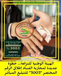 في إطار جهودها لتعزيز النزاهة وترسيخ الحكامة الجيدة، أعلنت *الهيئة الوطنية للنزاهة والوقاية من الرشوة ومحاربتها* عن إطلاق *مركز نداء جديد تحت الرقم المختصر 3003*، مخصص للتبليغ المباشر عن قضايا الفساد.