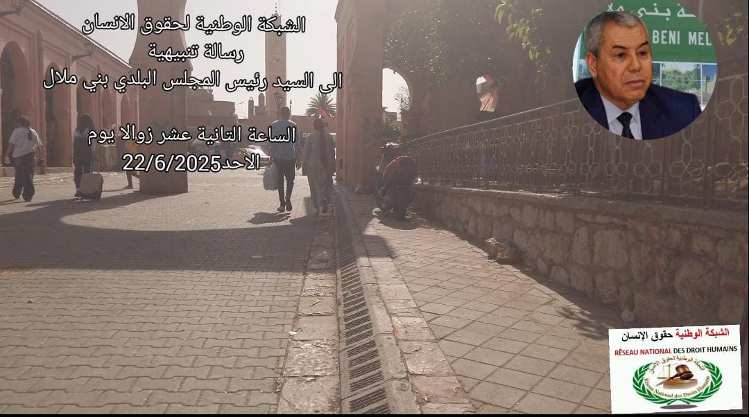 بلاغ حقوقي وتنبيهي إلى السيد والي جهة بني ملال خنيفرة المحترم من الأمانة العامة للشبكة الوطنية لحقوق الإنسان. فيديو صوت…